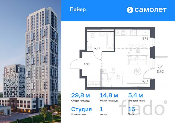 Предлагается квартира студия комфорт-класса 29,81 кв.м в корпусе 1 на 16 этаже, в ЖК «Пайер»