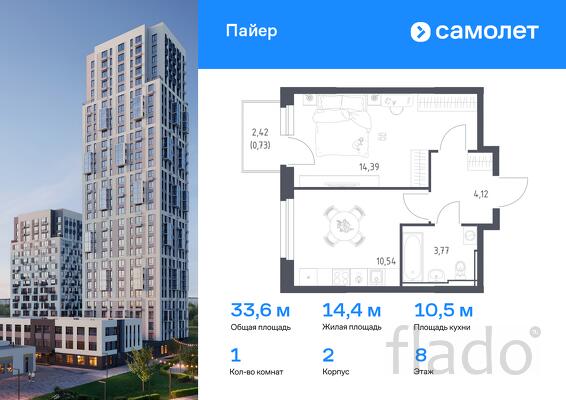 Предлагается 1-комнатная квартира комфорт-класса 33,55 кв.м в корпусе 2 на 8 этаже, в ЖК «Пайер»